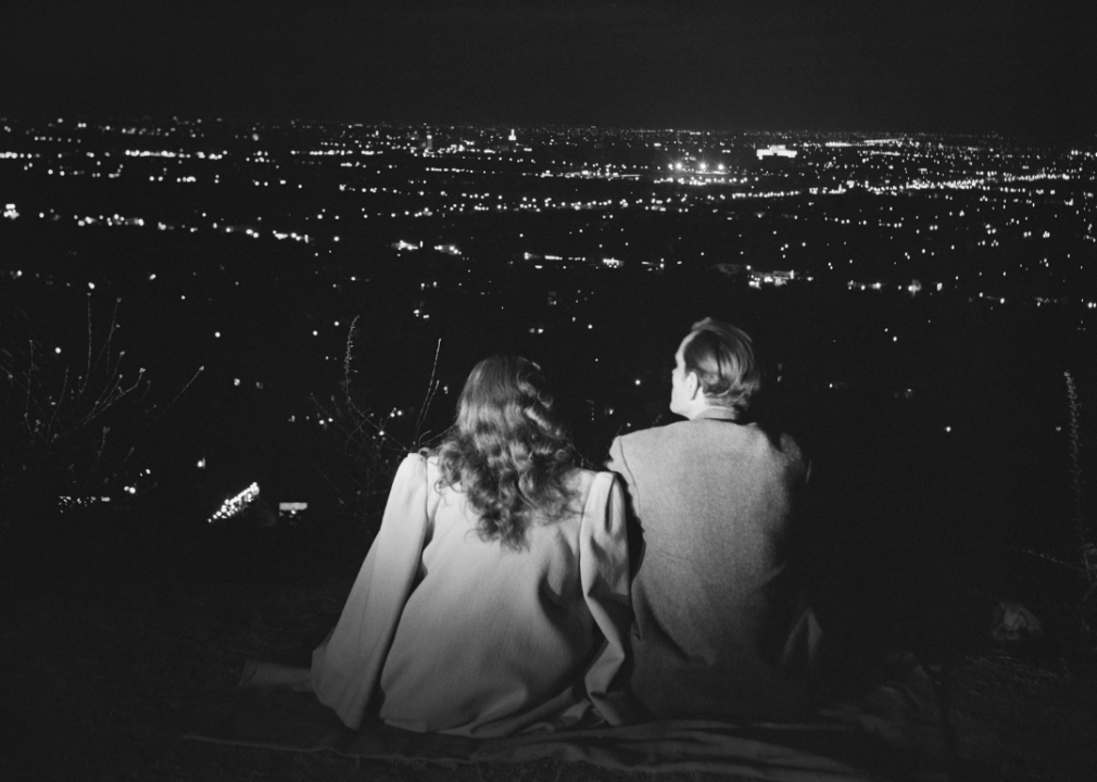 A young couple look out over the city from Mulholland Drive, a road that winds along the Santa Monica Mountains and boasts excellent lookout points, on a warm summer night in 1951.