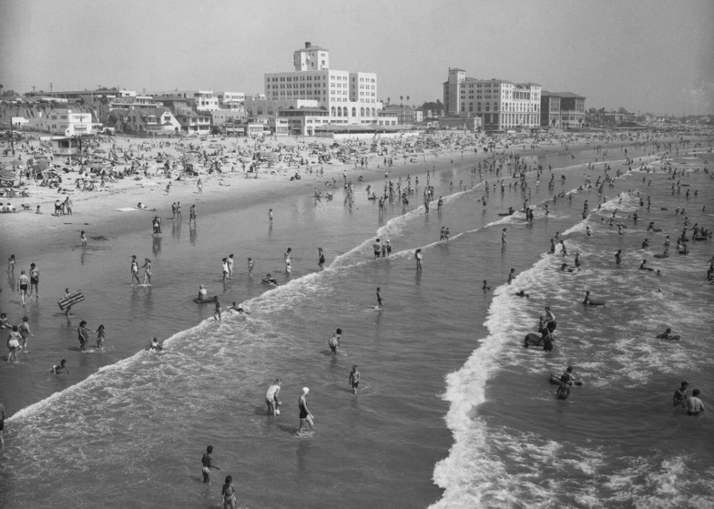 In 1955, LA experienced one of its worst heat waves in recorded history—for eight consecutive days in late August and early September, temperatures reached highs well over 100 degrees. Desperate for some relief, Angelenos flocked to the beaches, including the Santa Monica beach (pictured above) where the archives record some 300,000 people took a dip in the Pacific.