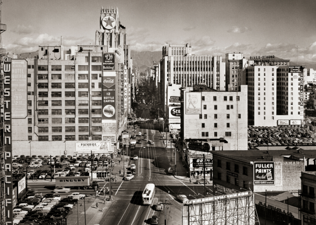 This aerial photograph of downtown LA captures one end of the city’s historical theater districts. At its height, the six-block stretch of Broadway had the largest concentration of movie theaters in the world and could seat more than 15,000 moviegoers.