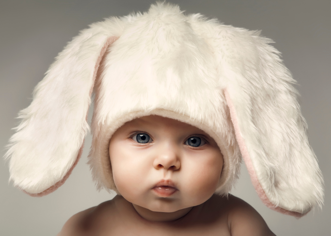 A baby in a furry bunny hat.