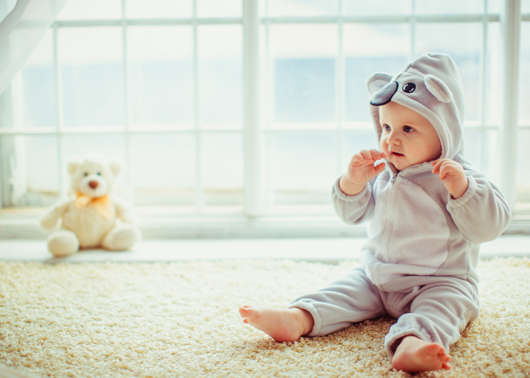 A baby sitting on carpet wearing an elephant outfit.