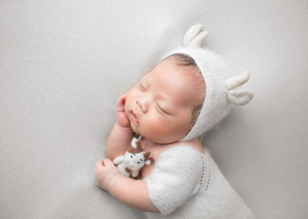 A sleeping baby wearing a fuzzy white outfit and hat with ears while cuddling a small brown and white cow.