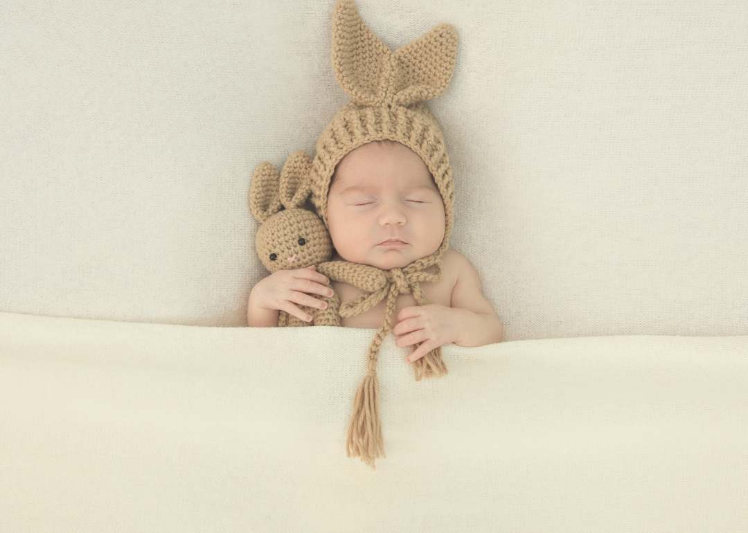 A sleeping baby in a brown hat with ears holding a bunny.