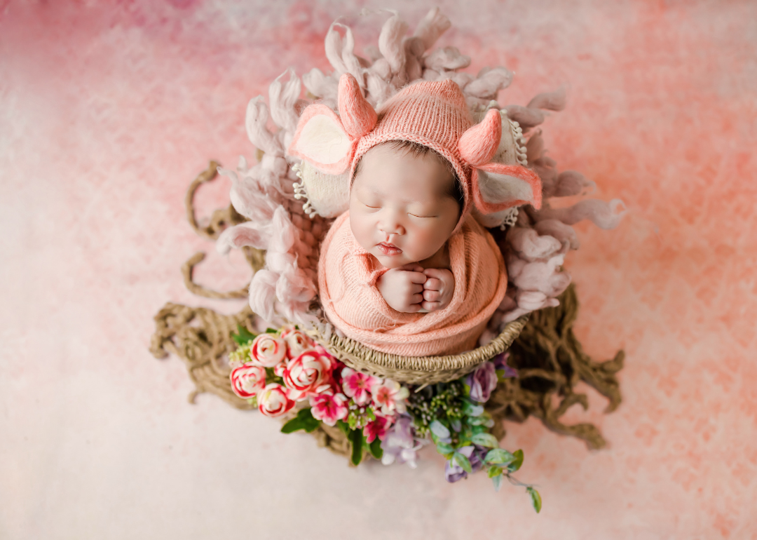 A baby in a peach outfit with ears inside a basket of flowers.
