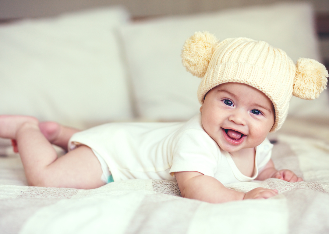 A baby smiling in a white onesie and hat with pom poms on the sides.