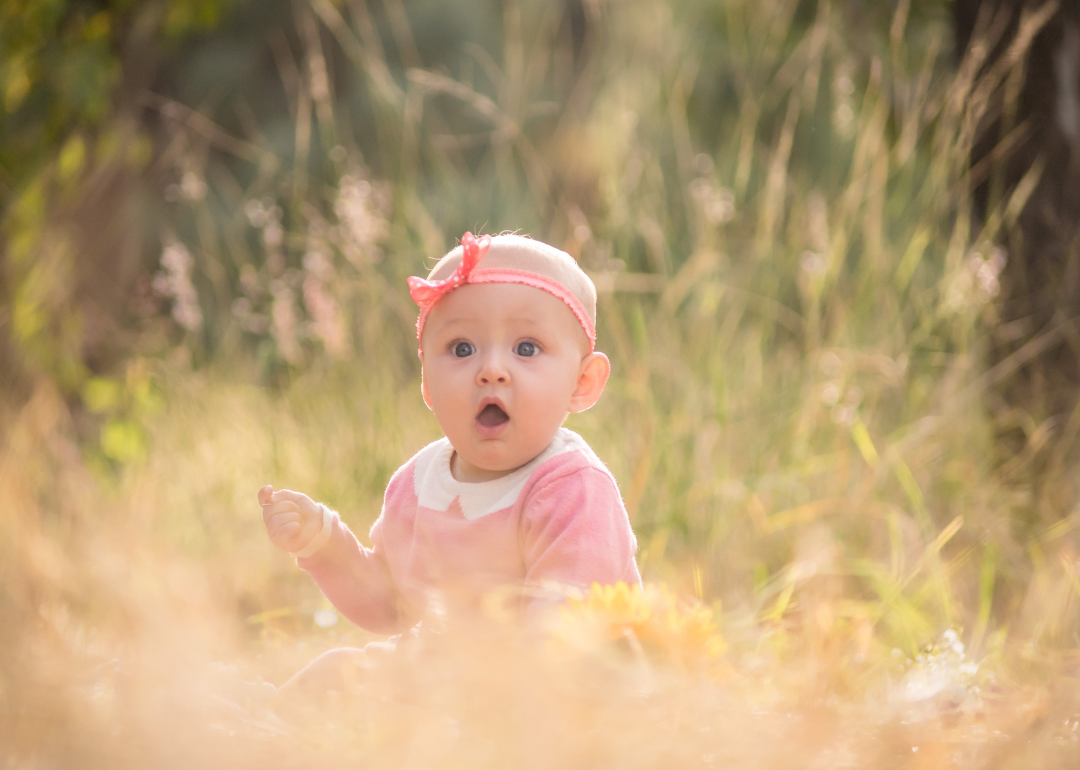 A baby with a surprised face sitting outside wearing a pink outfit and headband.