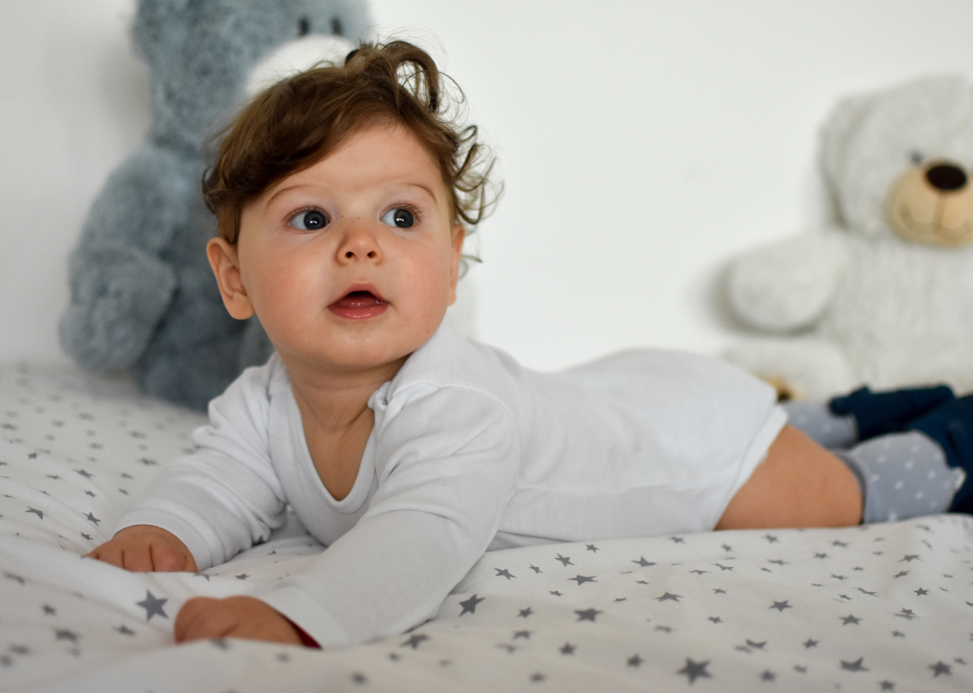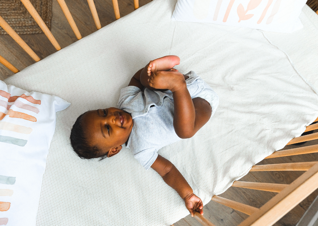 A baby lying in a crib wearing gray and white with stars and yawning.