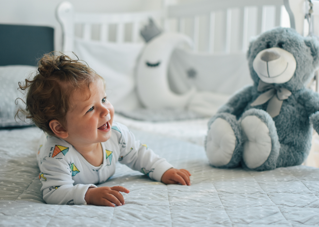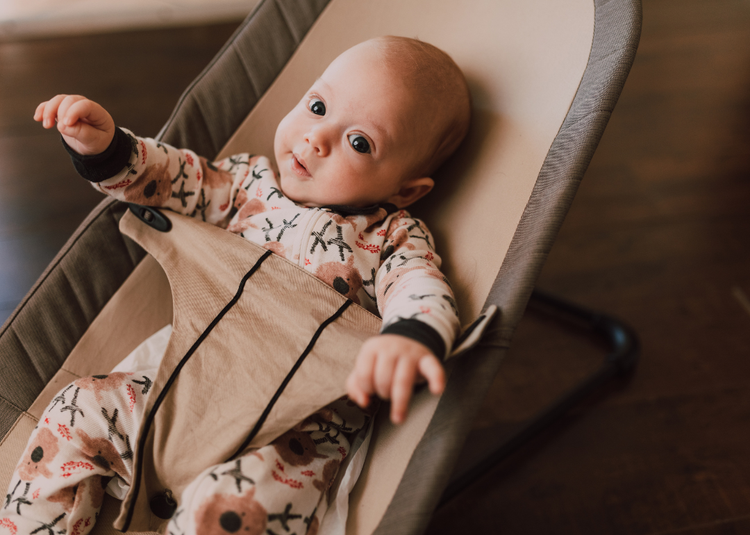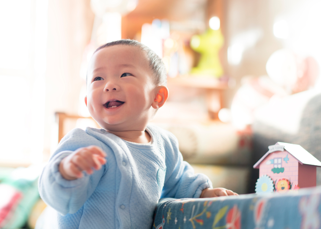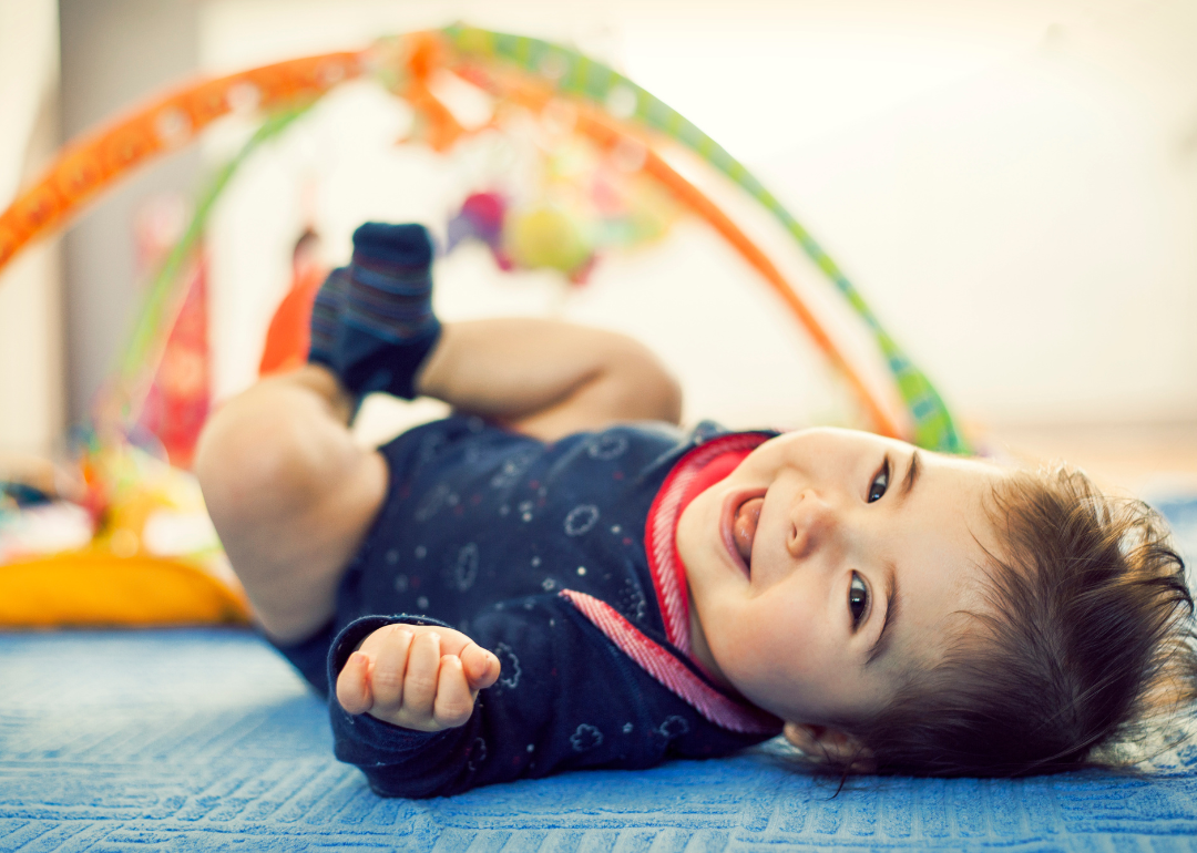 A smiling baby under a play gym.