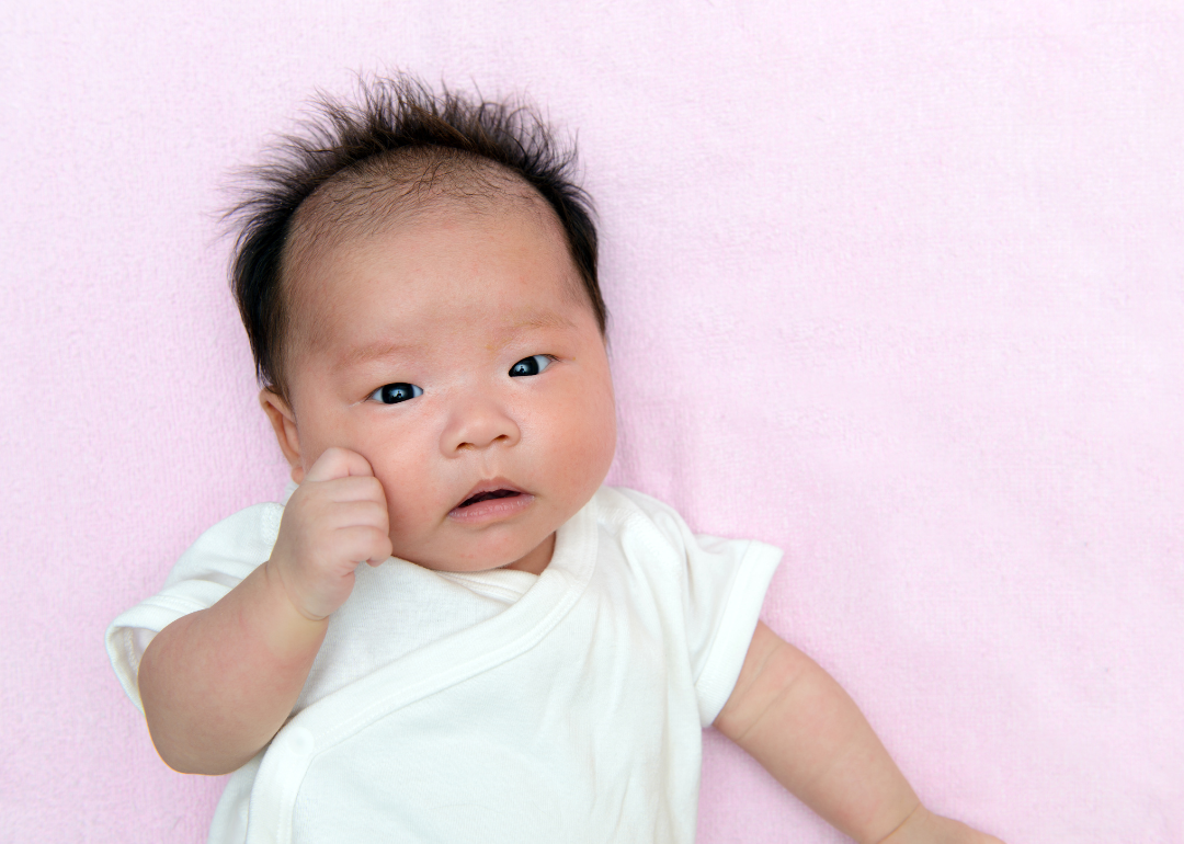 A baby in a white onesie on a pink blanket.