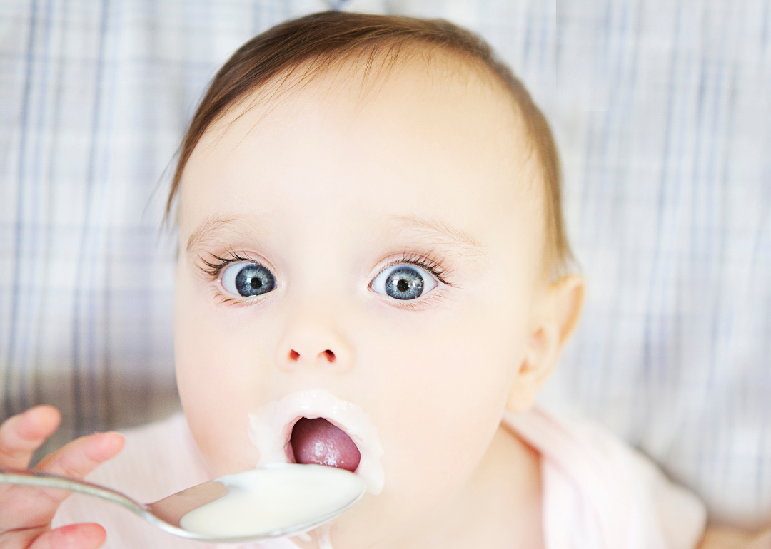 A baby eating yogurt.