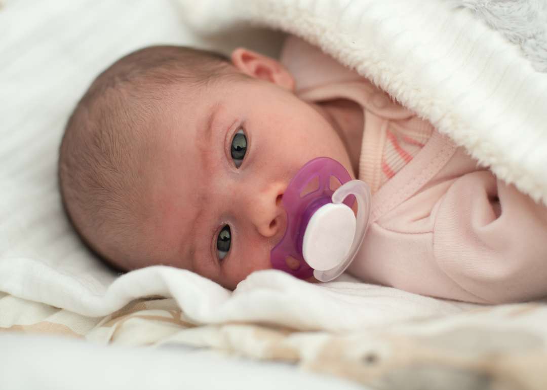 A baby in a blanket with a pacifier.