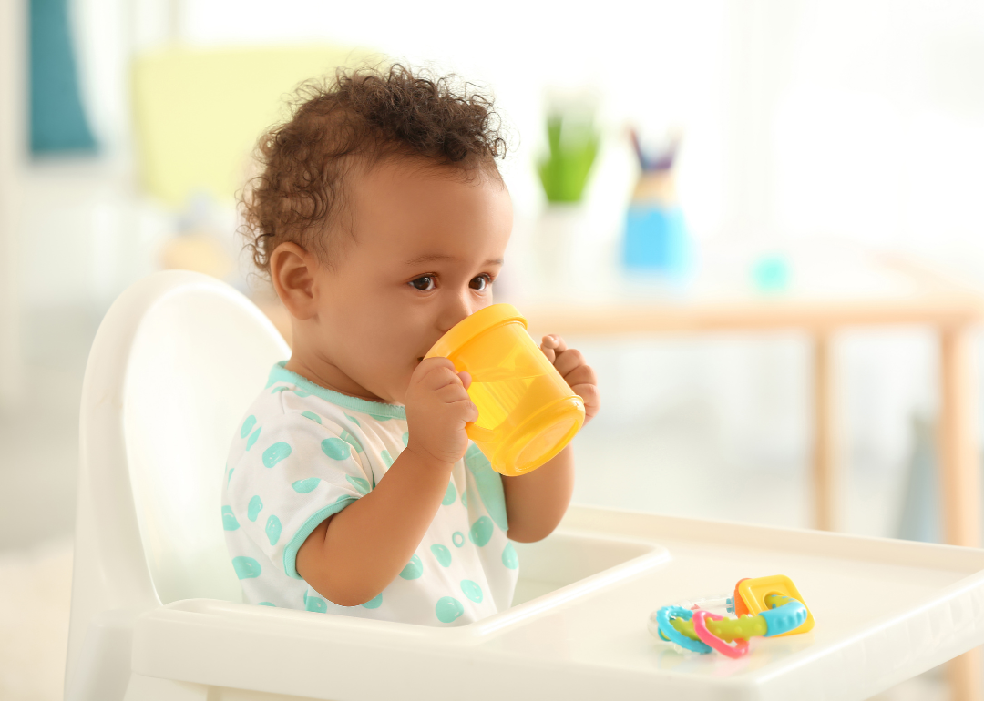 A baby in a high chair drinking from a yellow sippy cup.