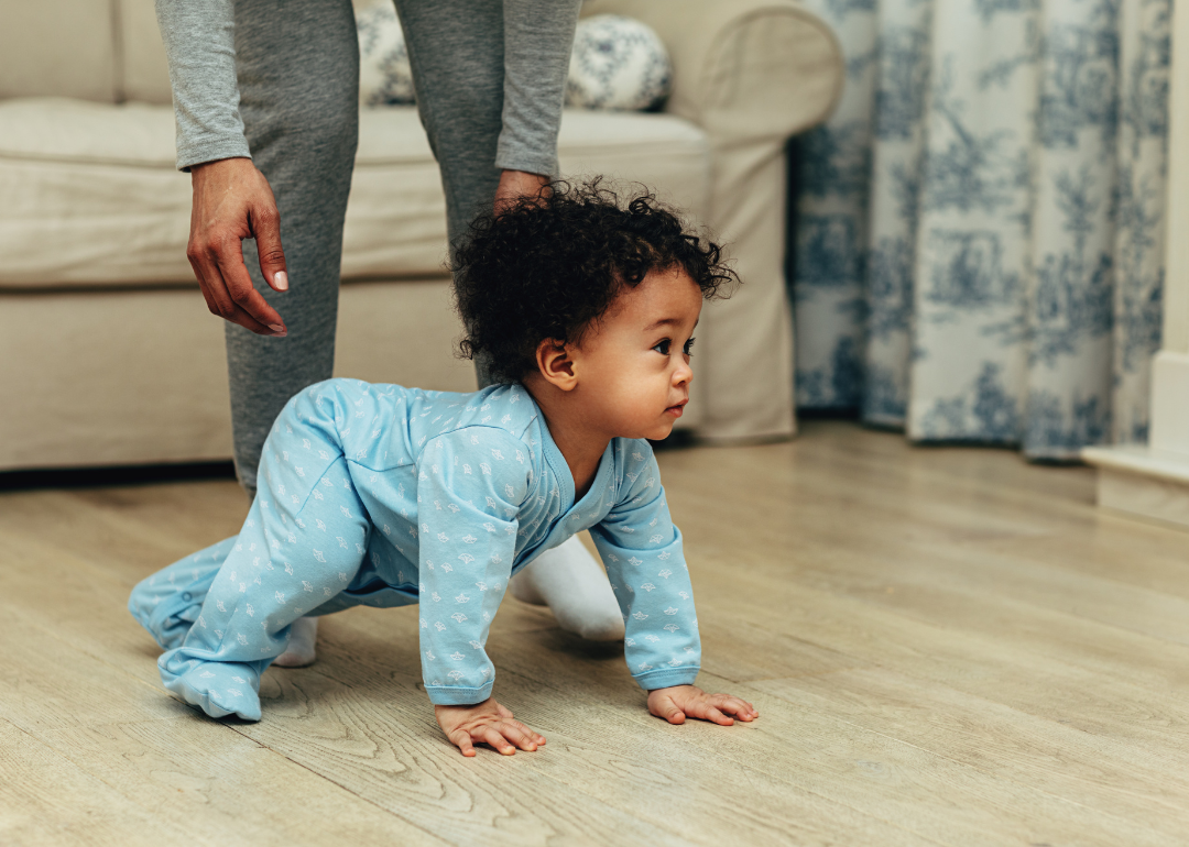 A baby in a blue onesie crawling.