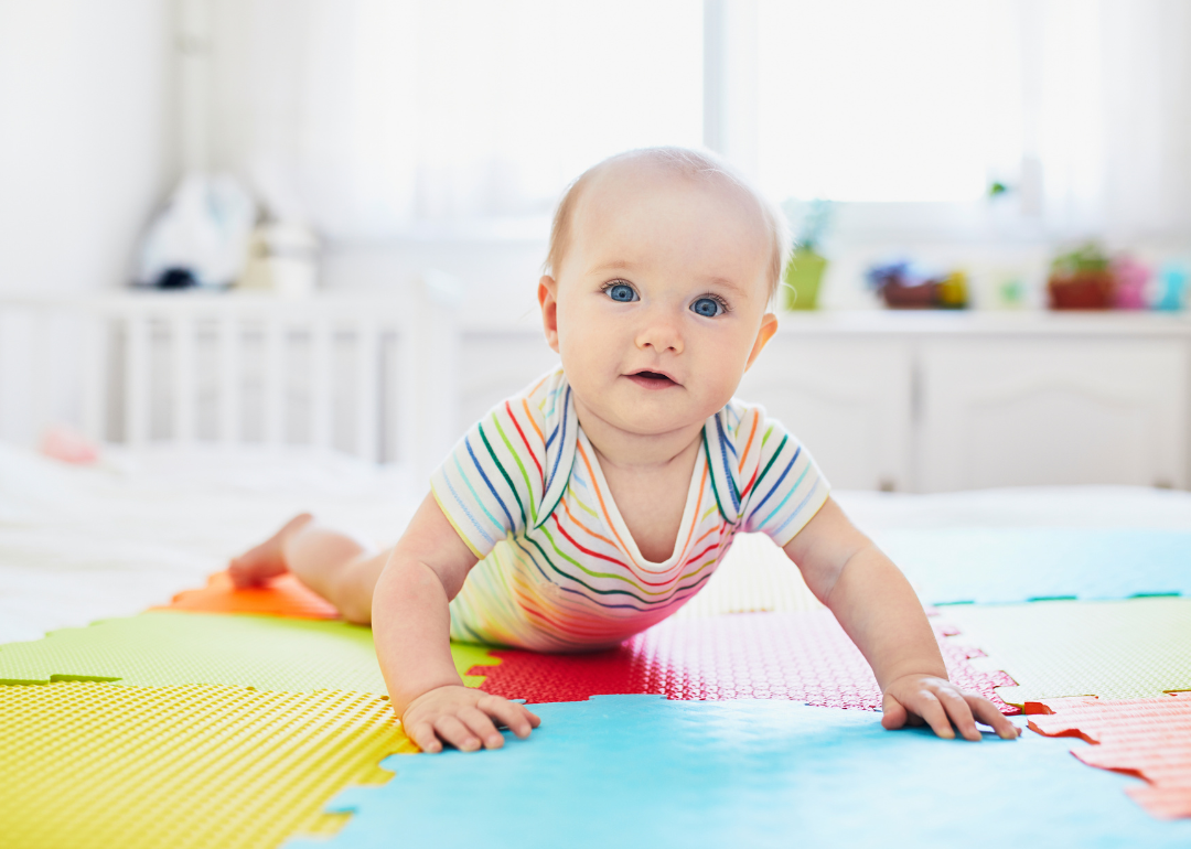 A baby on a colorful play mat.