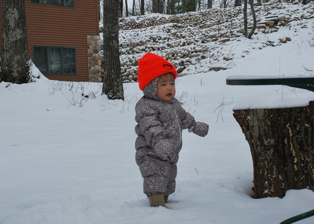 A baby in a leopard puffer suit and neon hat in the snow.