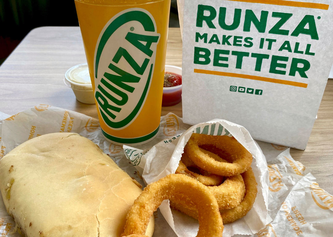 A classic Runza sandwich includes ground beef, onion, spices, and cabbage stuffed inside a small loaf of fresh-baked bread. Customers can order a Runza with various flavors, including BBQ Bacon, Spicy Jack, Swiss Mushroom, and Italian sausage. Runza also sells its signature double-dipped onion rings as a side, as well as crispy crinkle fries. Diners can also get a combination of both with a bag of “Frings!”