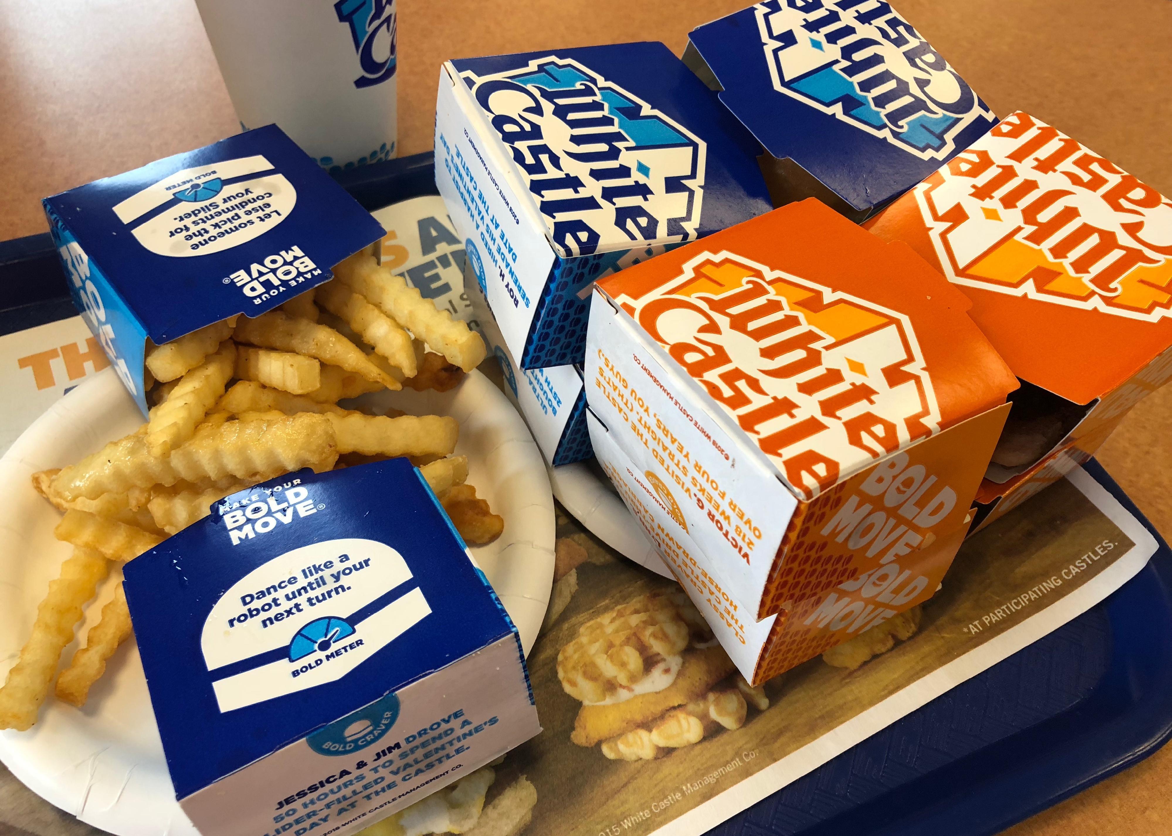 Boxes of fries and White Castle burgers.