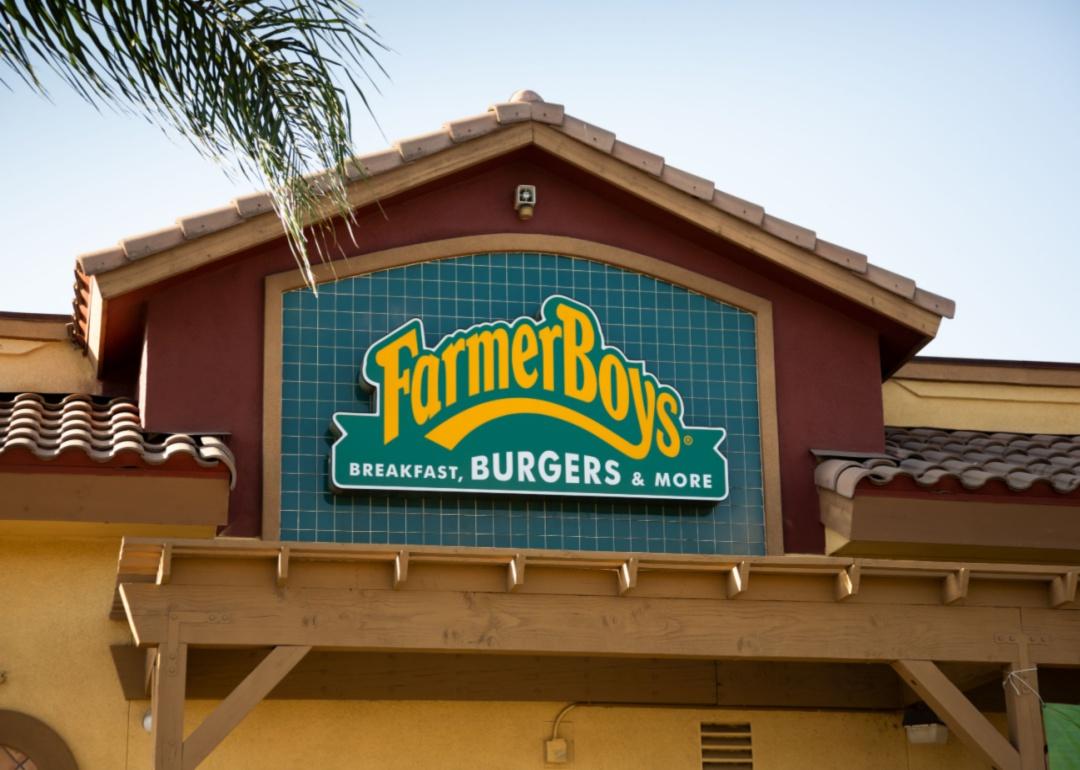 A green and yellow sign on a Farmer Boys restaurant.