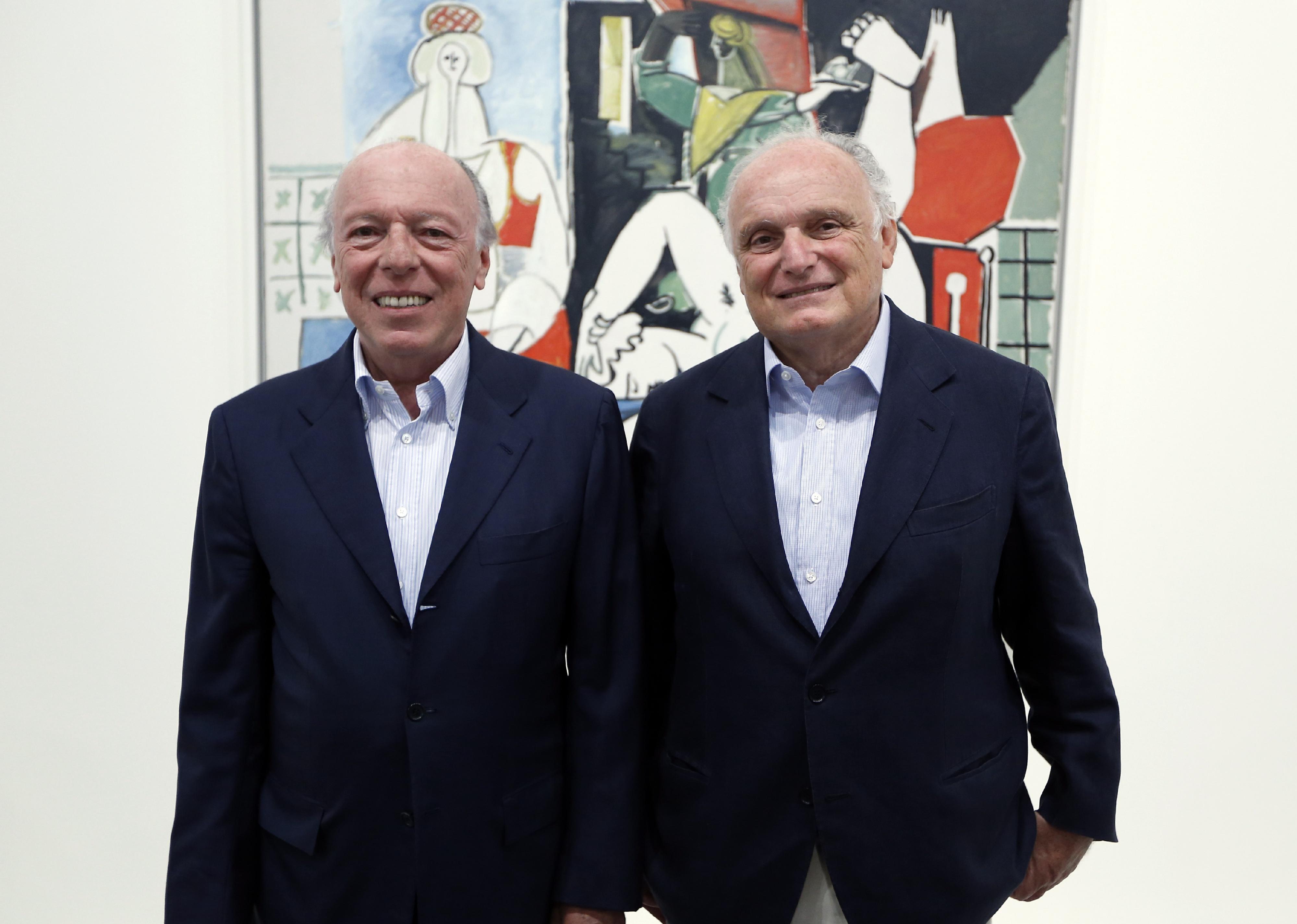 David Nahmad and Ezra Nahmad pose in a room of an exhibition dedicated to Pablo Picasso.