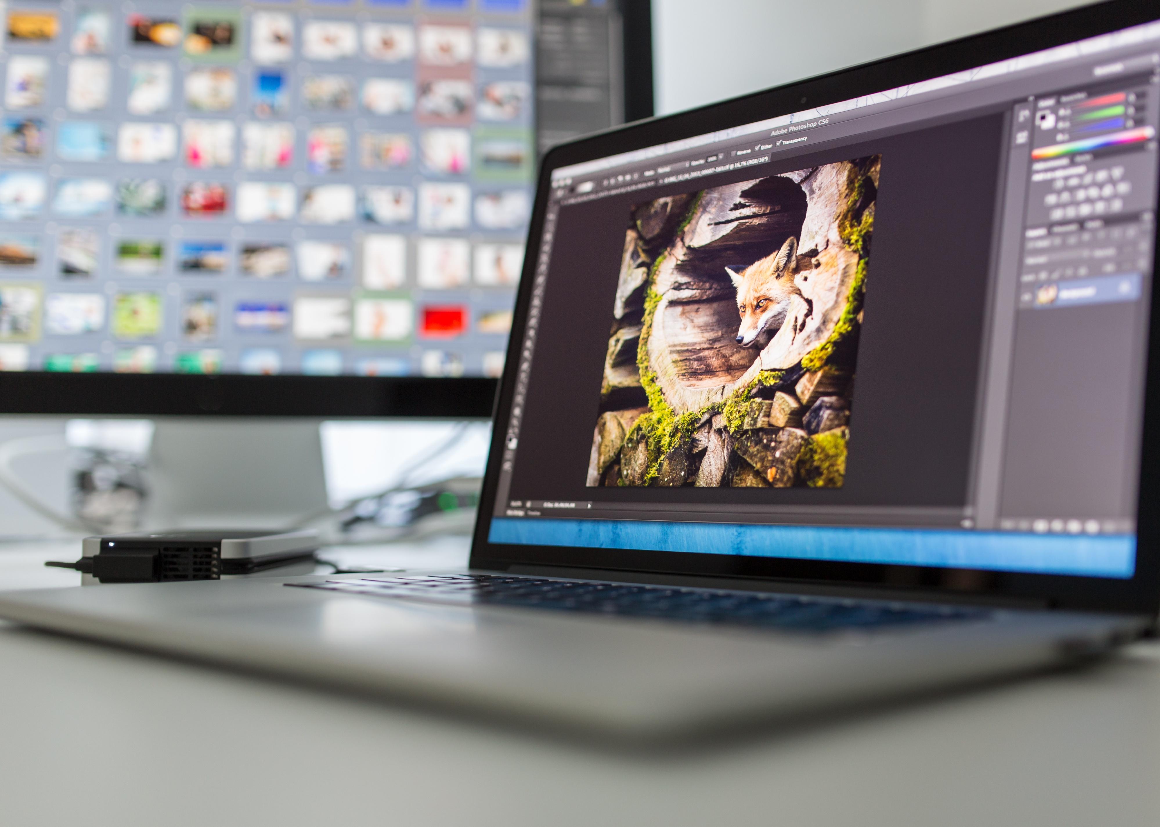 A computer with a photo of a fox open in Adobe Photoshop.