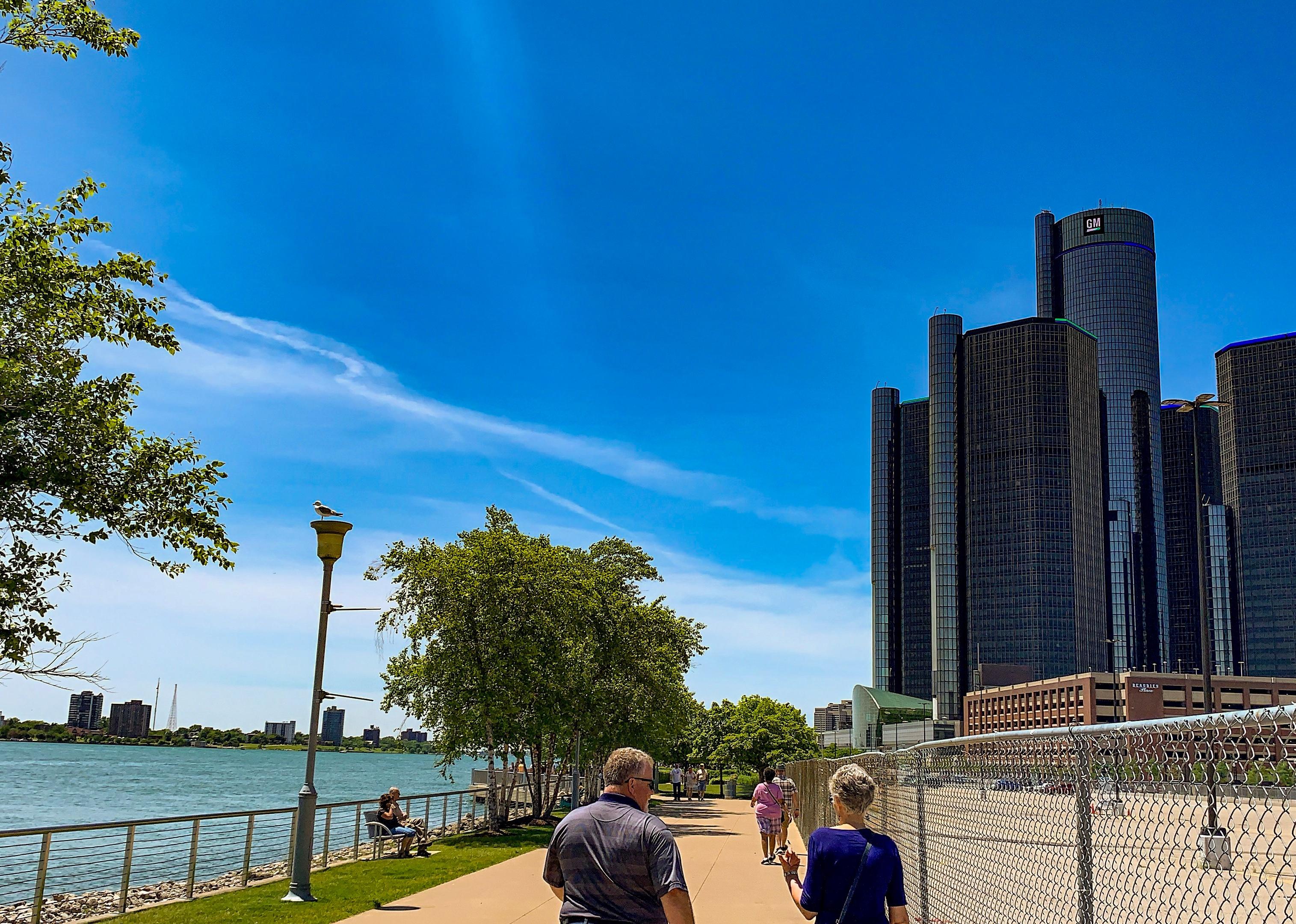An older couple walking along the water near downtown Detroit.