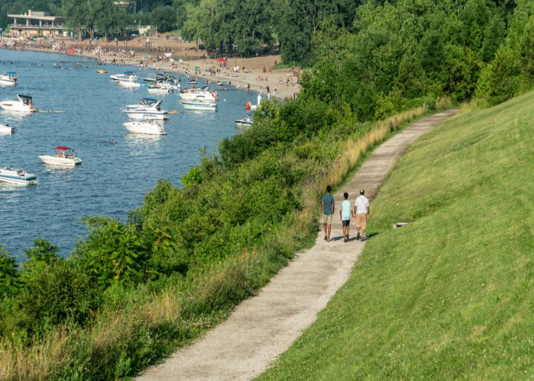 A family walking along the shore of Lake Erie.