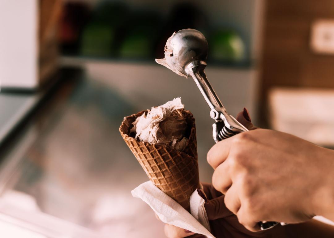 Person scooping ice cream into waffle cone.