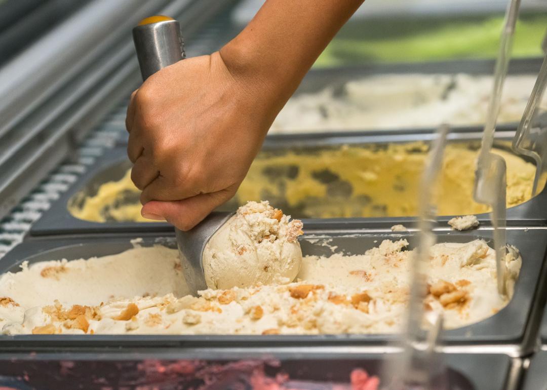 Person scooping ice cream from container.