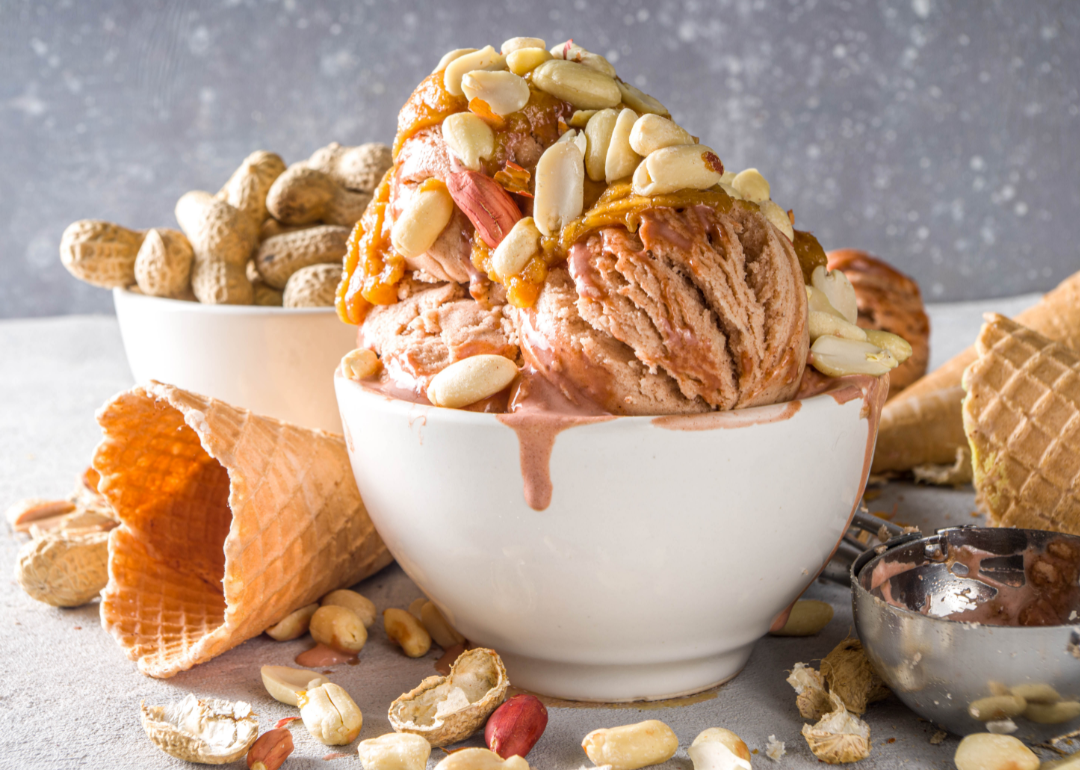 Bowl of peanut butter ice cream with peanut toppings.