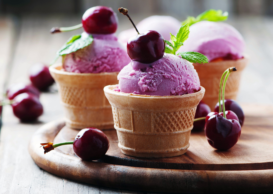 Cone cups of cherry ice cream with fresh cherries.