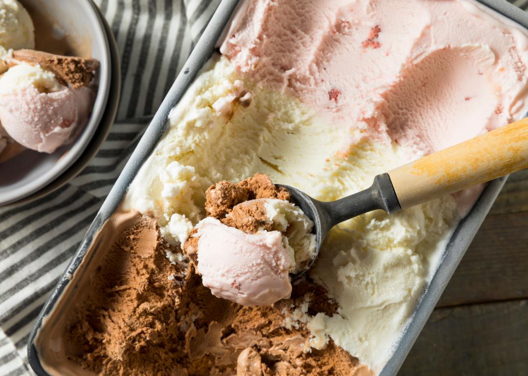 Scoop in container of Neapolitan ice cream.
