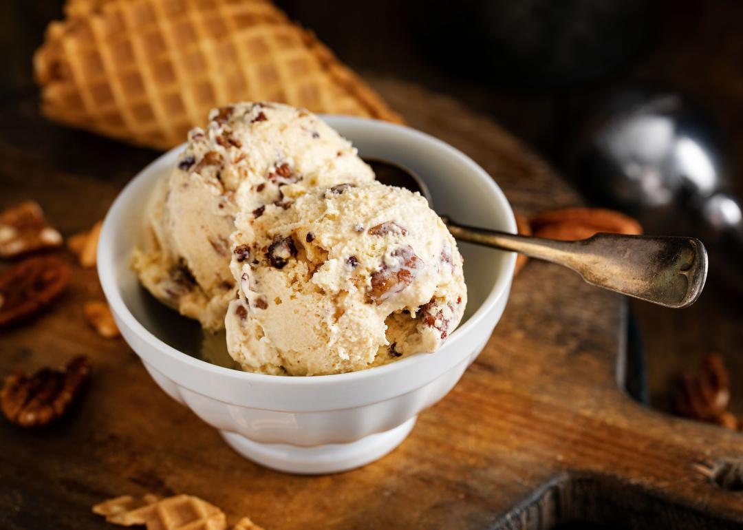 Bowl of butter pecan ice cream with spoon.
