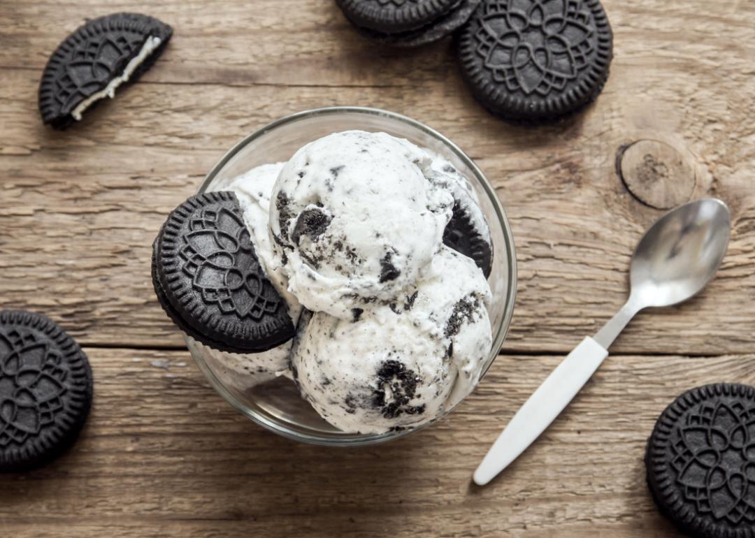 Cookies and cream ice cream bowl on wooden background.