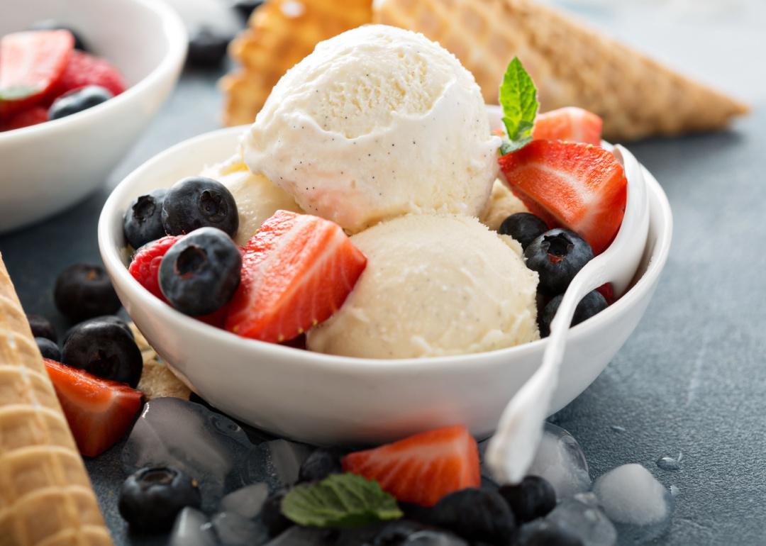 Bowl of vanilla ice cream with fresh berries.