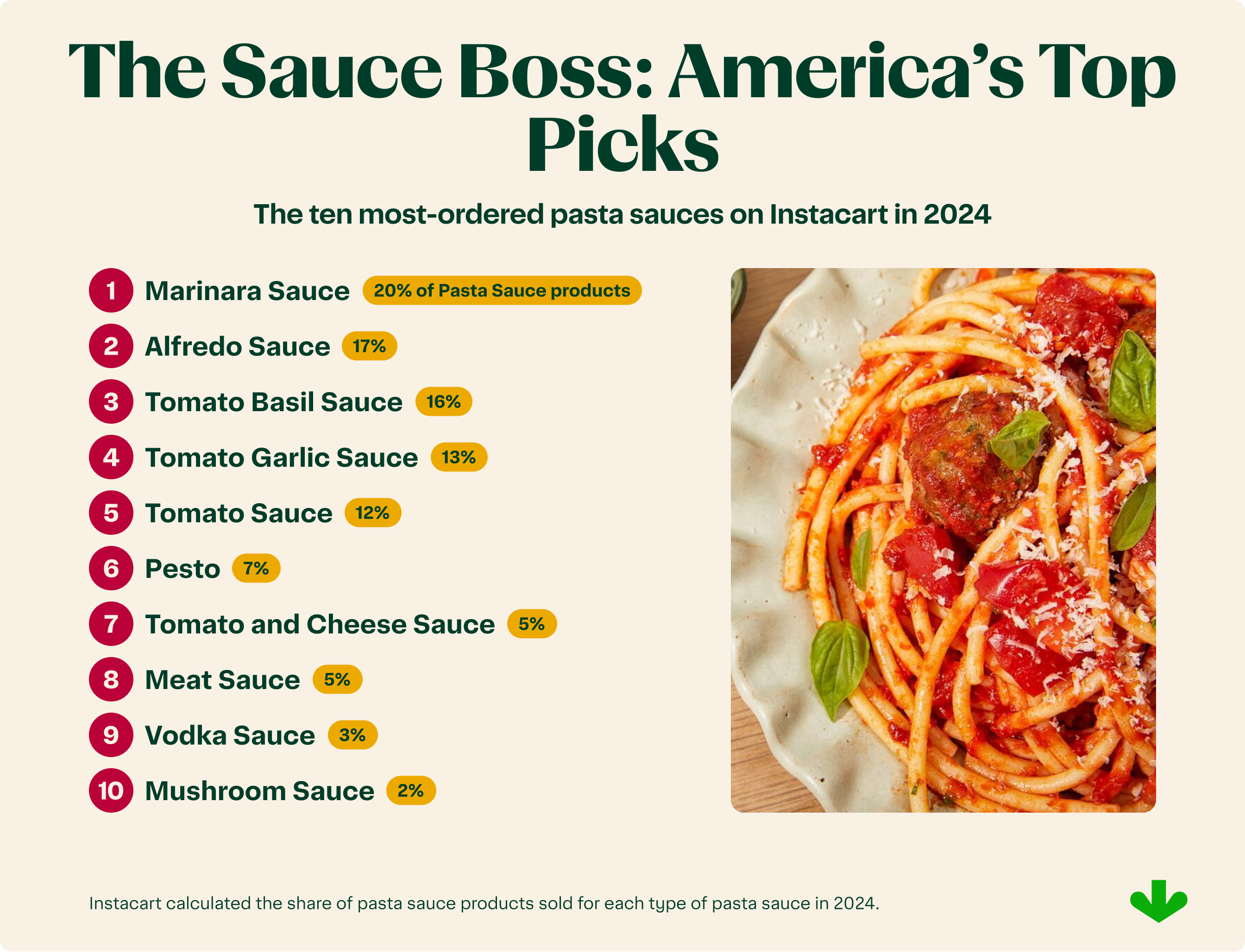 Infographic showing top 10 most-ordered pasta sauces on Instacart in 2024.
