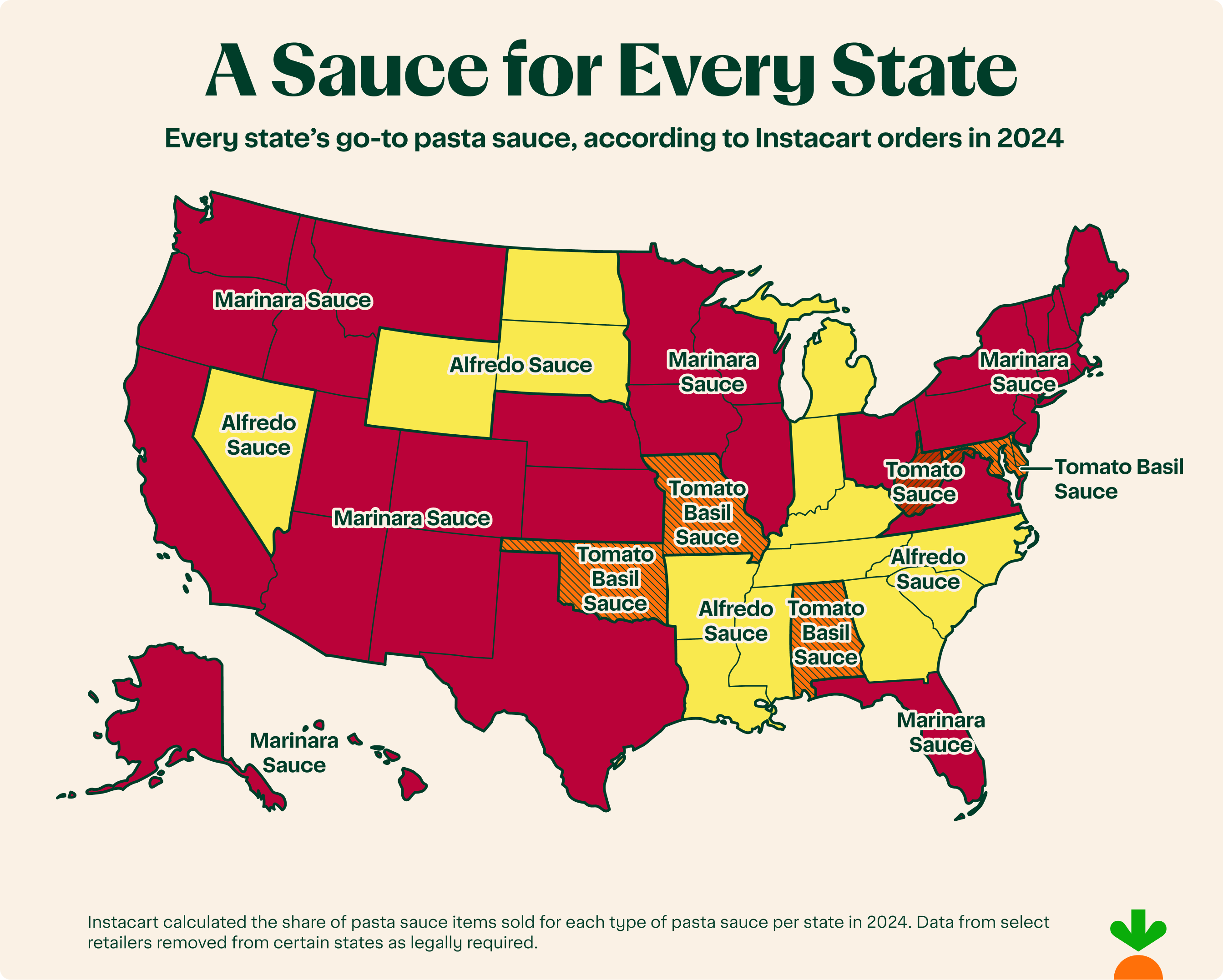 To celebrate National Sauce Month this March, Instacart takes an in-depth look at the most popular pasta sauces across the nation, by city and state, according to its proprietary data. Whether you prefer a fresh pesto or tangy marinara, it’s clear this is a nation that loves to get saucy. Through a delicious data deep dive, take a look at the sauces most frequently landing in consumer carts and the ones that might be left on the shelf.