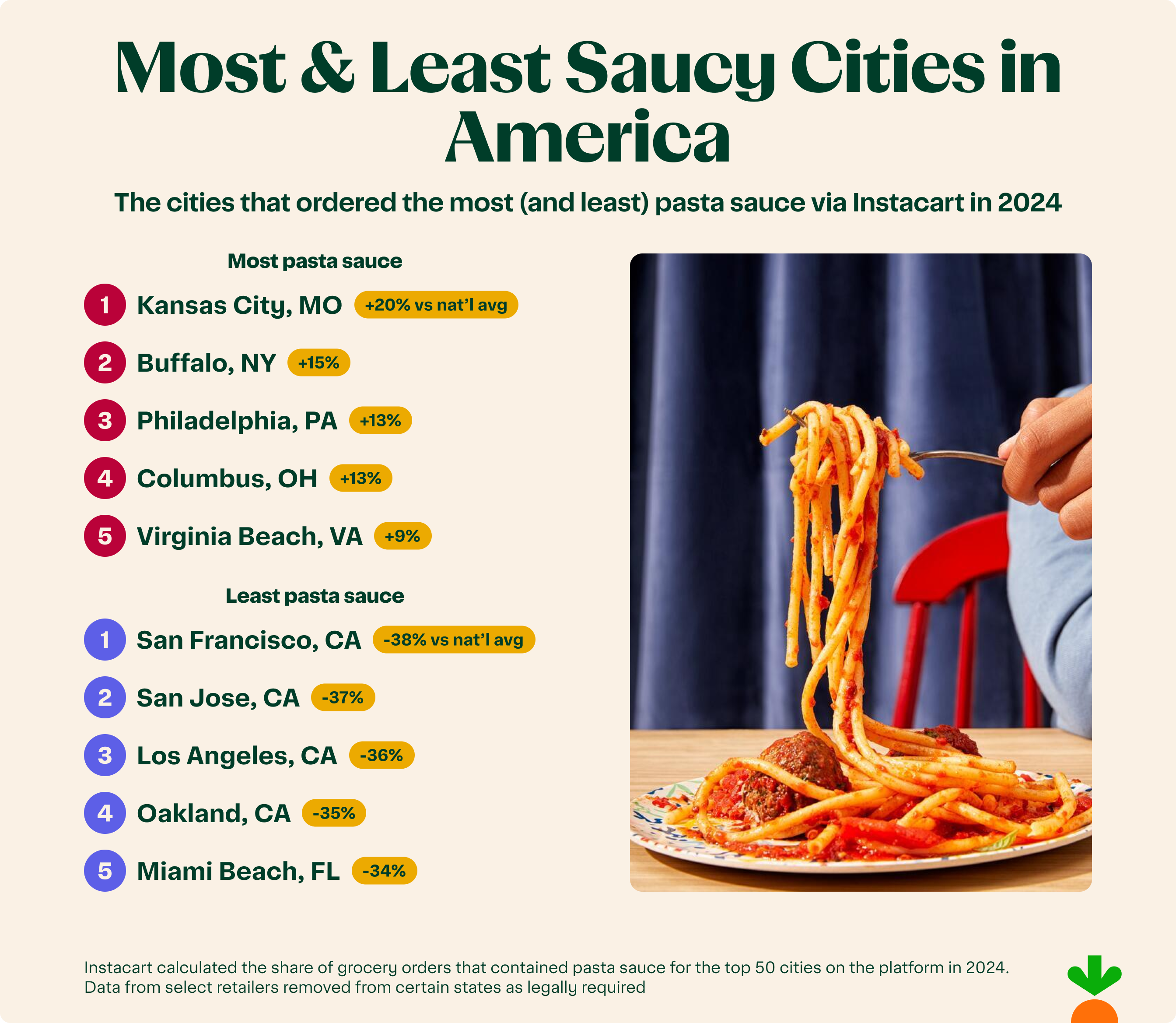 Kansas City, MO isn’t just about barbecue—it also took the top spot in pasta sauce purchases, ordering 20% more often than the national average. On the other end of the spectrum, foodie-filled San Francisco ordered pasta sauce the least, at 37% below the national average.