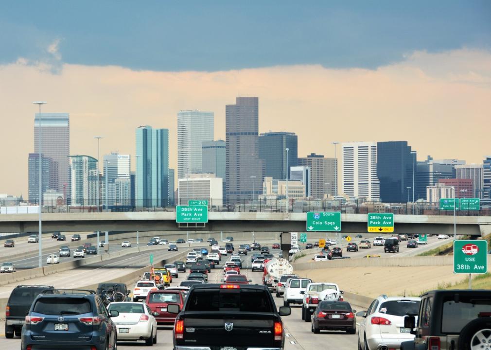 Traffic on the highway heading toward downtown Denver.