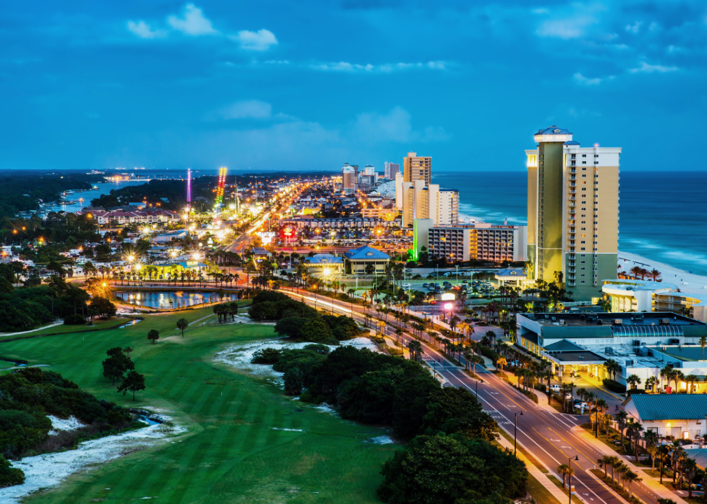 Roads and buildings lit up in Panama City Beach, Florida.