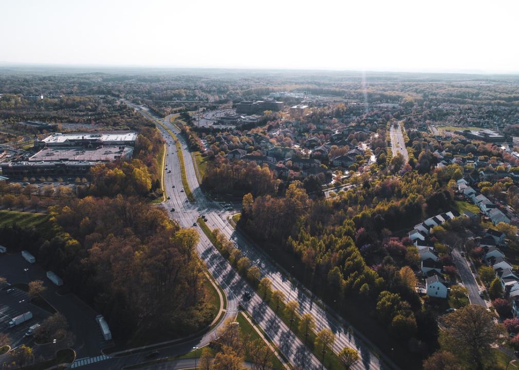 An aerial view of residential neighborhoods and roads in Montgomery County, Maryland.