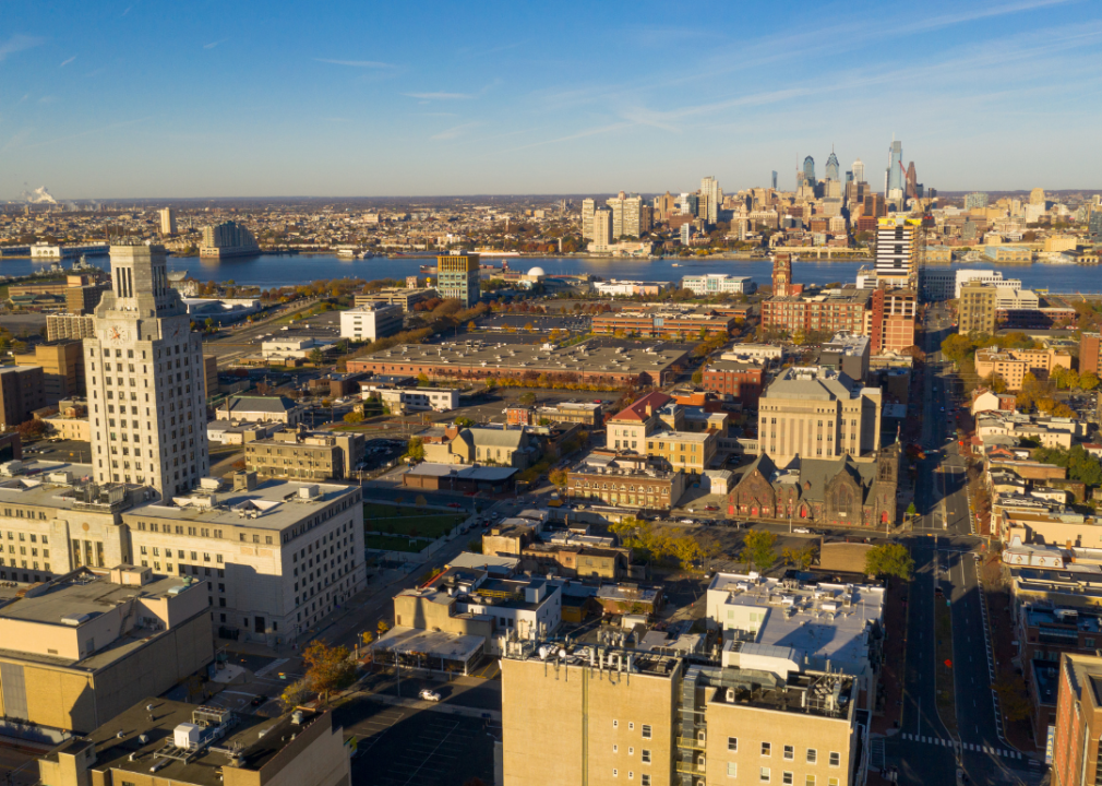 Aerial view over Camden, New Jersey with Philadelphia across the river.
