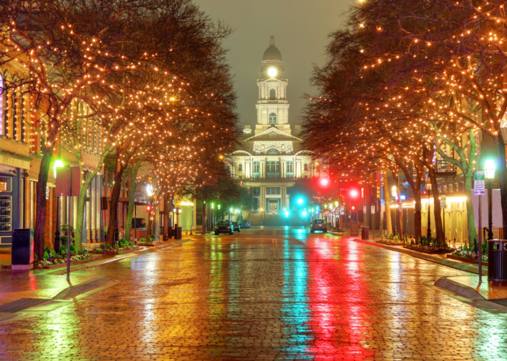 Trees covered in lights line main street in Fort Worth, Texas at night.