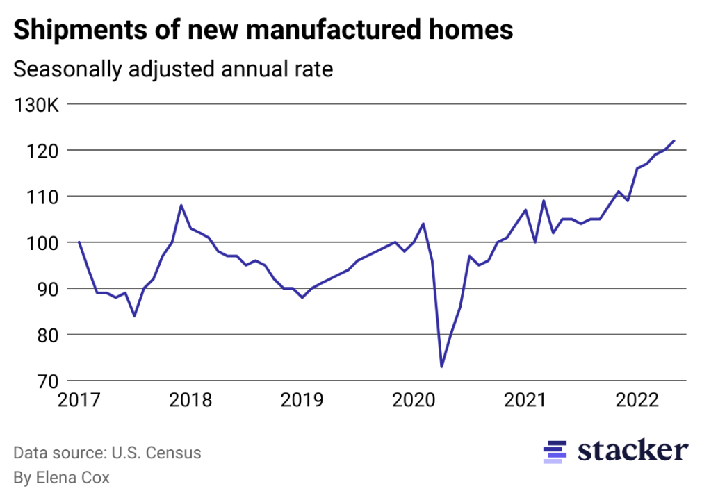 Consolidation among businesses that produce manufactured housing means that prices can swing more dramatically from month to month compared with single-family homes. That’s according to French, who told Stacker that prices have been coming down in his state in recent months as lumber and other goods become cheaper.