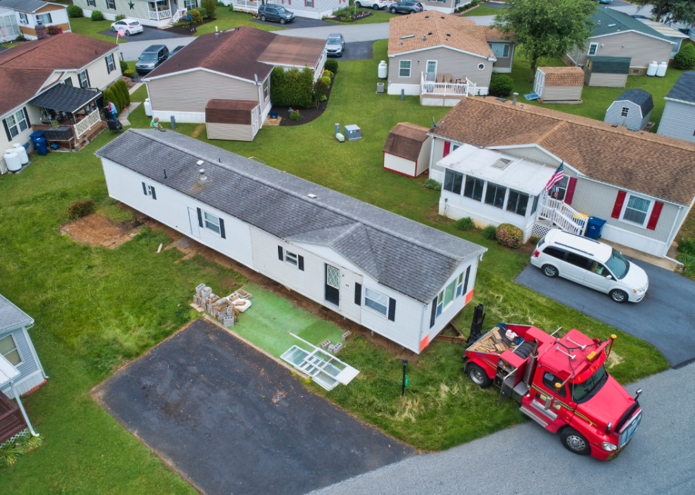 A manufactured, mobile, prefab home being removed from a lot in a park