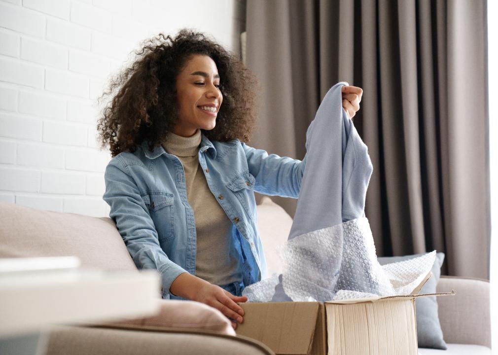 Woman pulls out a sweater from a cardboard box