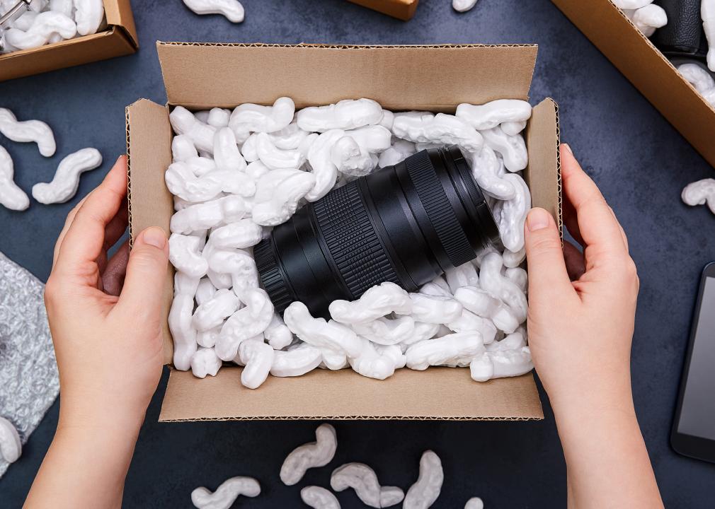 Female hands unpacking parcel with camera lens inside