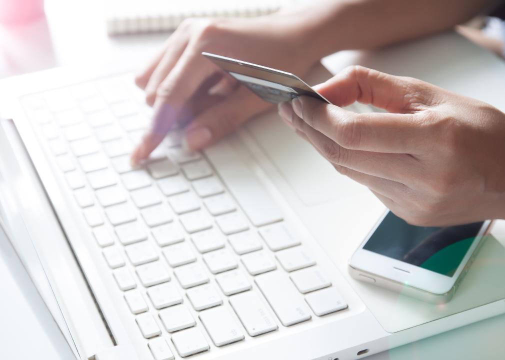 Hand holding credit card and using laptop