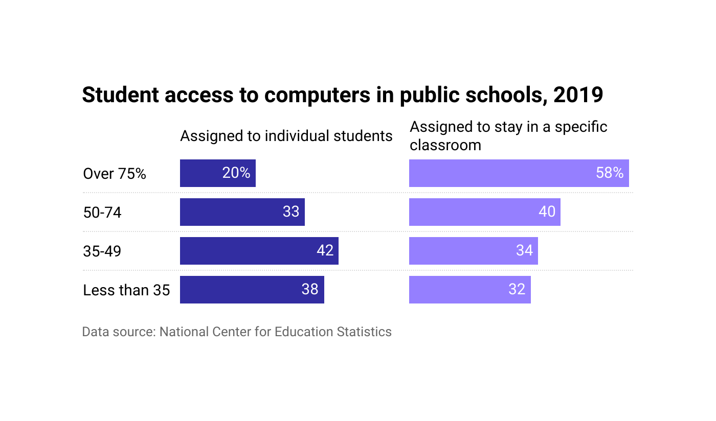 In the 2019-2020 school year, about 15% of public schools let all students take computers home with them, and another 8% allowed students in some grades to do so, per the NCES. Another 15% let students take computers home short term, and 9% provided mobile hotspots or devices that connected to the web and included paid data plans.