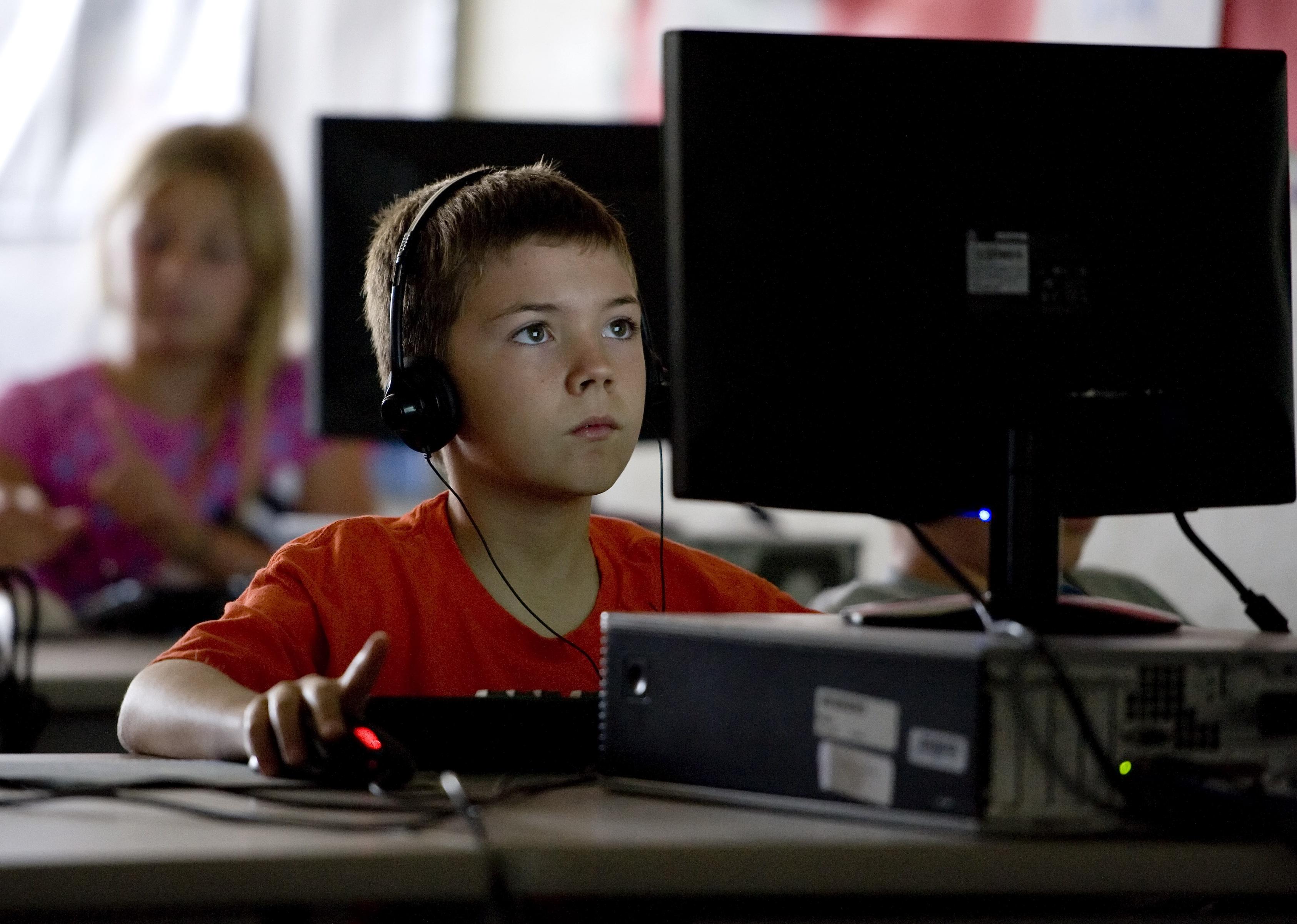 A third grade student sits at a computer working while wearing headphones.