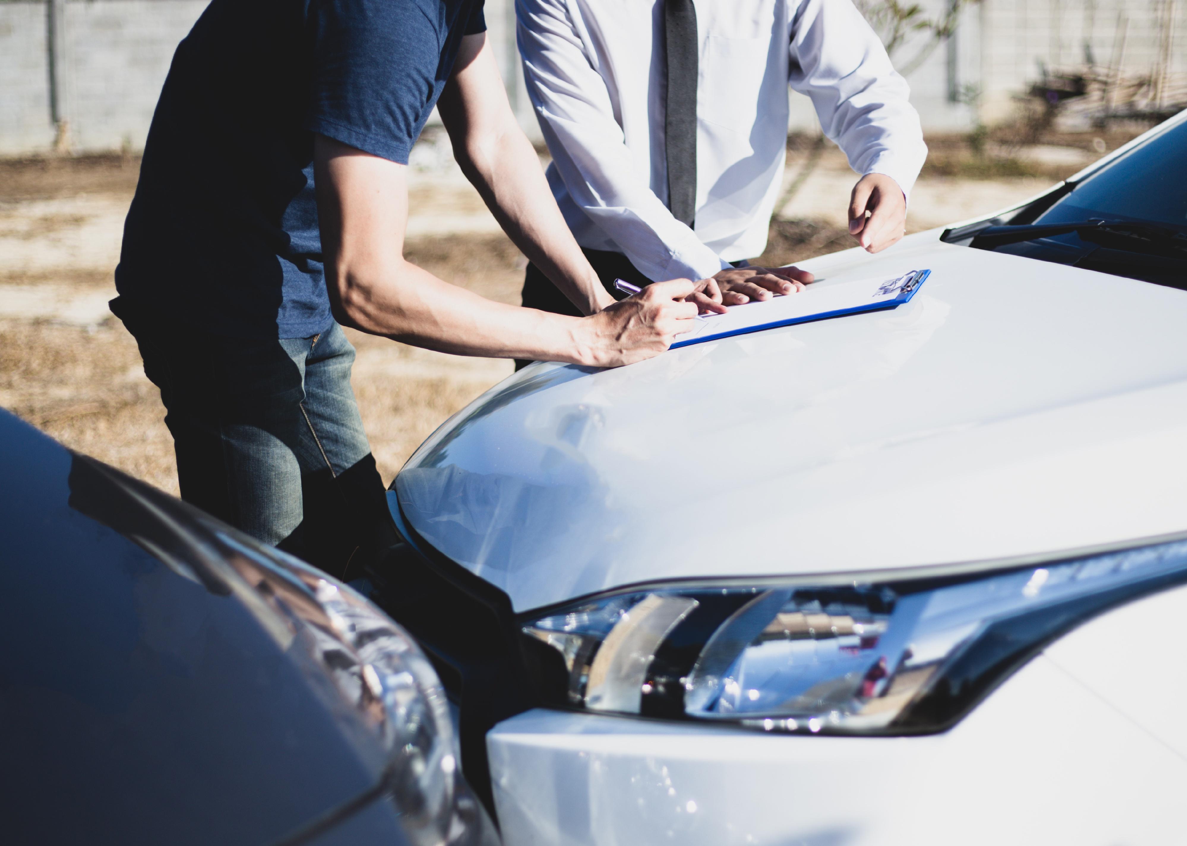 Man and insurance agent look at paperwork after car crash